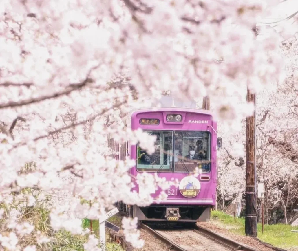 조금 더 활동적인 벚꽃 구경을 원하신다면 토롯코 열차를 이용해 보시길 추천해요. 클래식한 열차를 타고 계곡을 따라 달리는 경험은 그 자체로 설레는 일이죠. 특히 선로 양옆으로 벚나무가 길게 늘어선 구간에서는 마치 벚꽃 사이를 뚫고 지나가는 듯한 기분을 느낄 수 있습니다. 터널을 빠져나올 때마다 새롭게 펼쳐지는 계곡의 전경과 가까이 피어있는 벚꽃의 조화가 토롯코 열차만의 확실한 매력입니다.