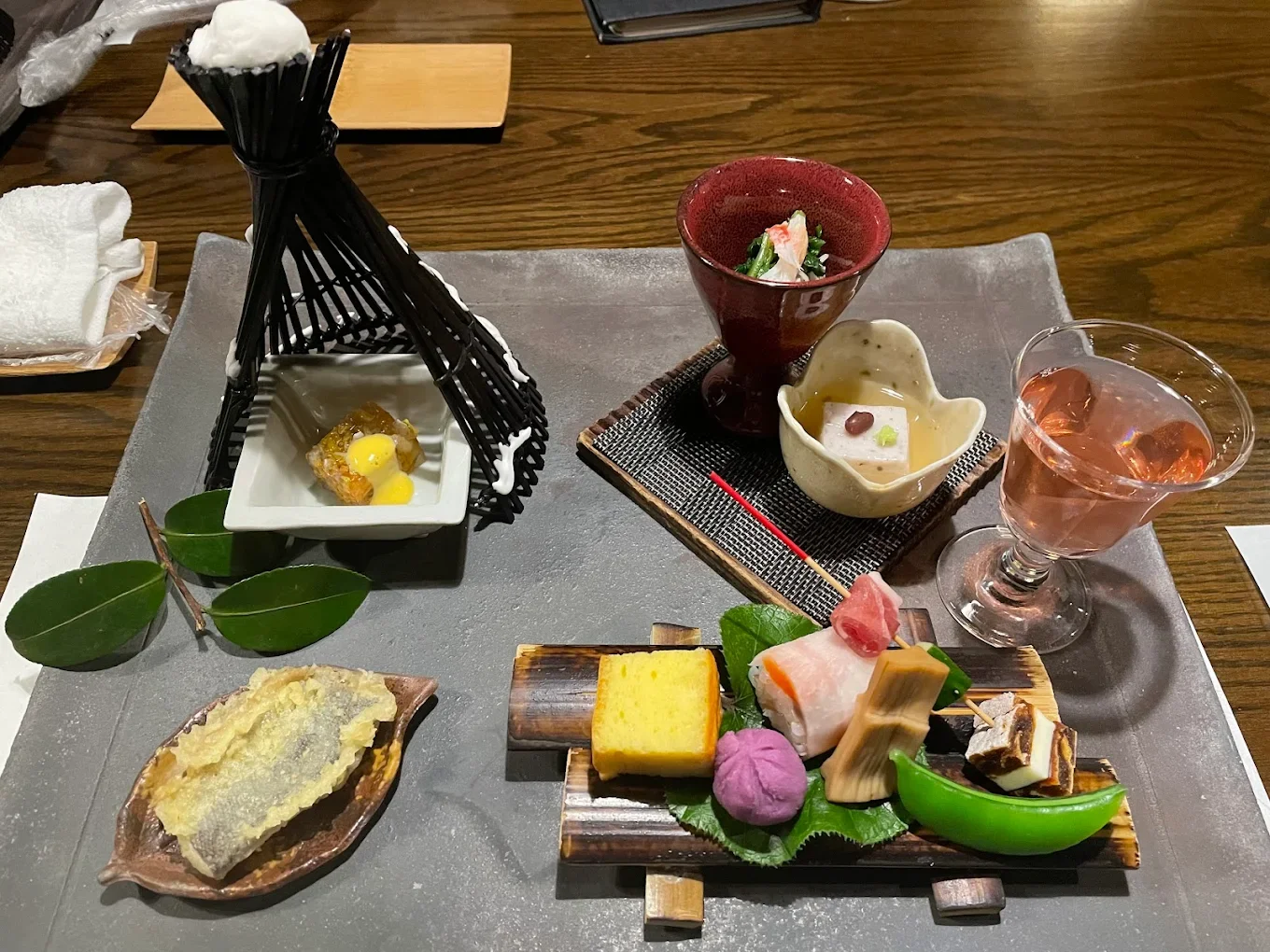 료칸 산가에 숙박하게 된다면 가이세키도 꼭 드셔보세요 아소 지역의 신선한 식재료로 정성스럽게 준비된 한 상 가득한 요리는 맛 뿐만 아니라 담음새에서 정성이 느껴집니다. 여행 중 한 끼 정도는 가이세키를 경험해보셨으면 좋겠습니다.