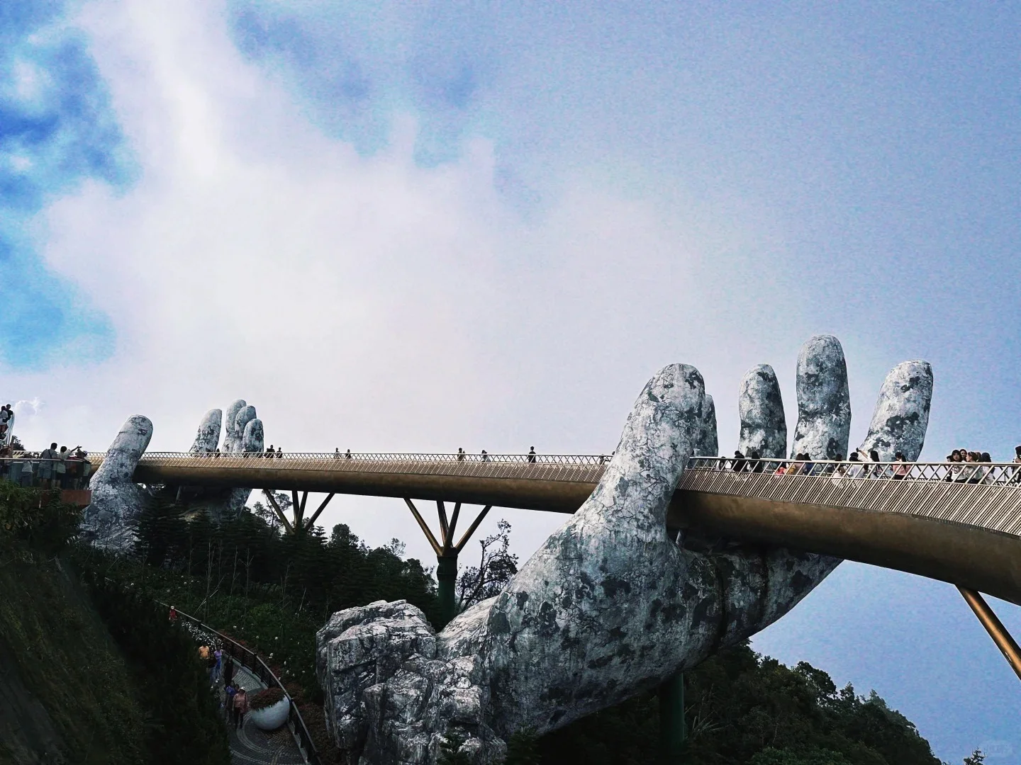 세계 2번째로 긴 케이블카(5,771m, 약 20분)를 타고 올라가면 거대한 두 손이 받치는 황금빛 다리(길이 150m, 해발 1,414m)가 구름 위에 펼쳐집니다. 2018년 개장과 동시에 베트남의 랜드마크가 된 골든브릿지에서 인생샷을 남겨보세요.