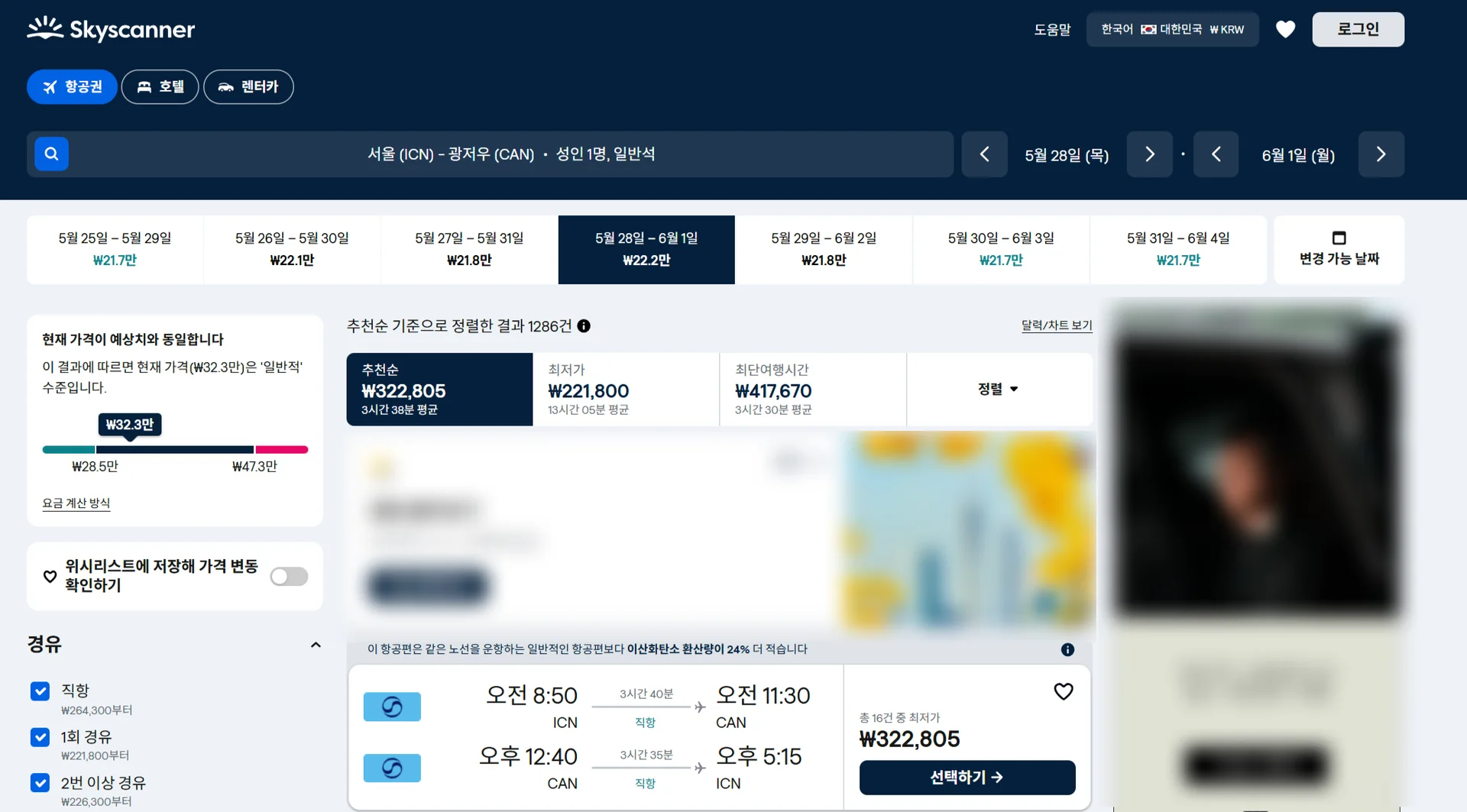 패키지 상품과 동일한 날짜의 항공권을 직접 검색해 보면 32만원인걸 확인할 수 있죠.