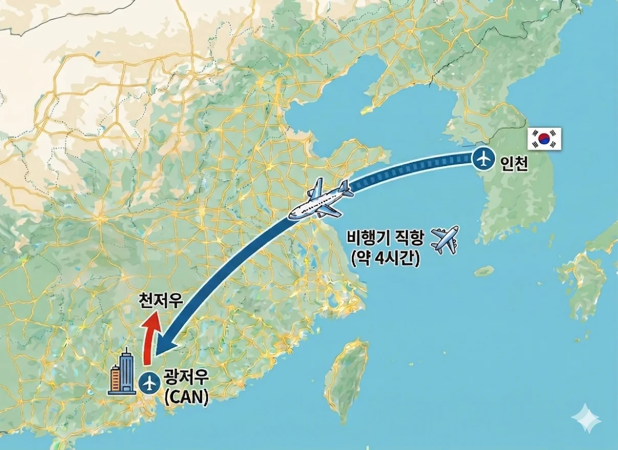 현재 한국에서 천저우로 바로 들어가는 직항편은 없구요. 따라서 가장 합리적이고 방법은 광저우 직항까지 직항 항공편을 이용하는 것 입니다. 광저우에서 가벼운 시내 관광 후 휴식을 취하고, 다음 날 차량으로 천저우로 이동하는 코스를 추천합니다.