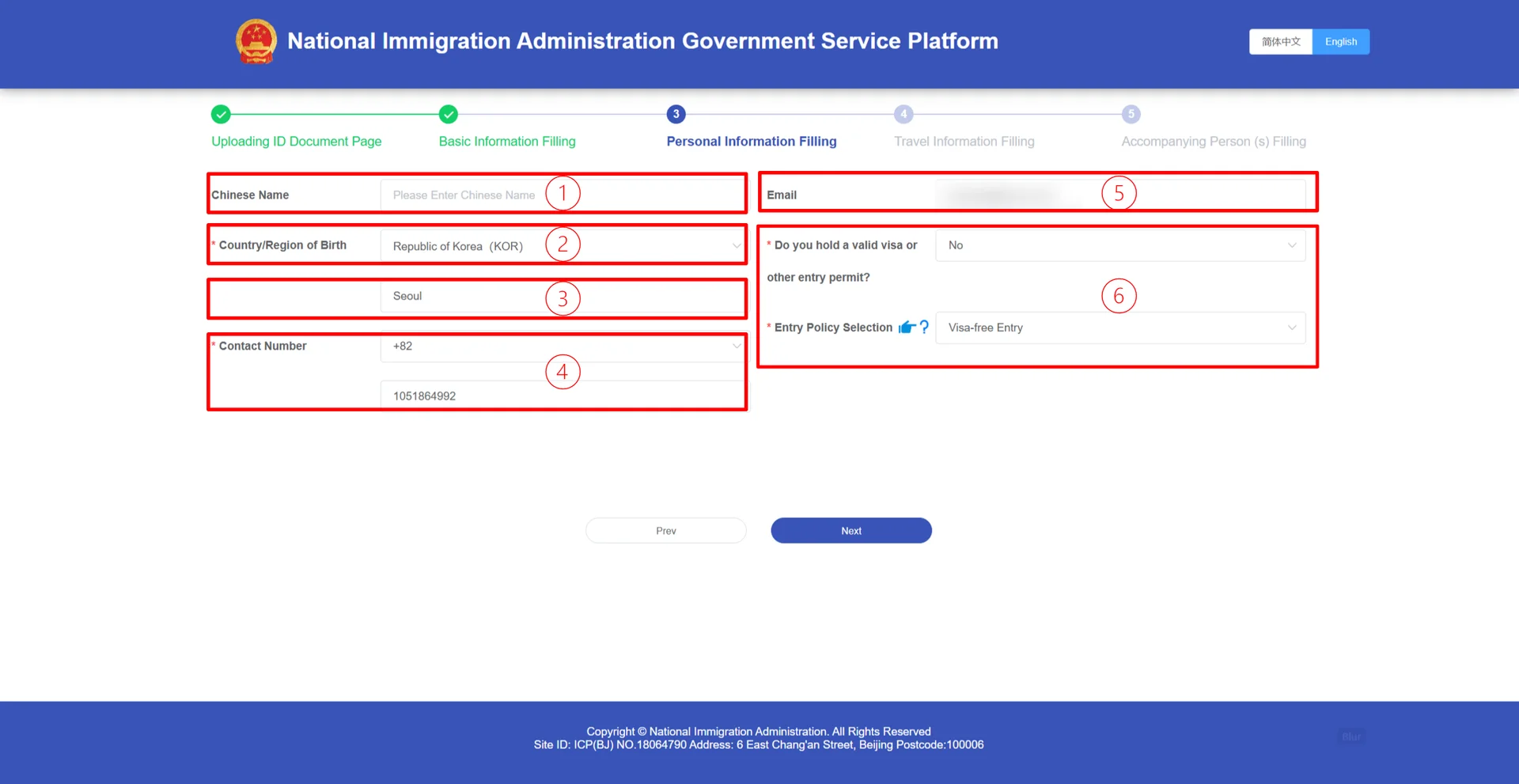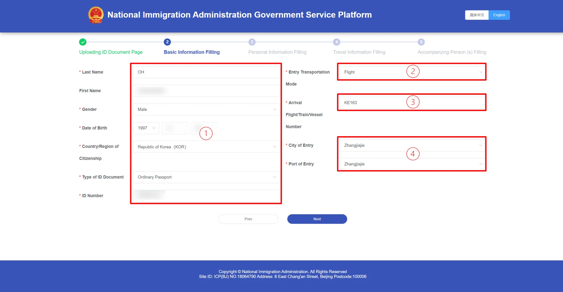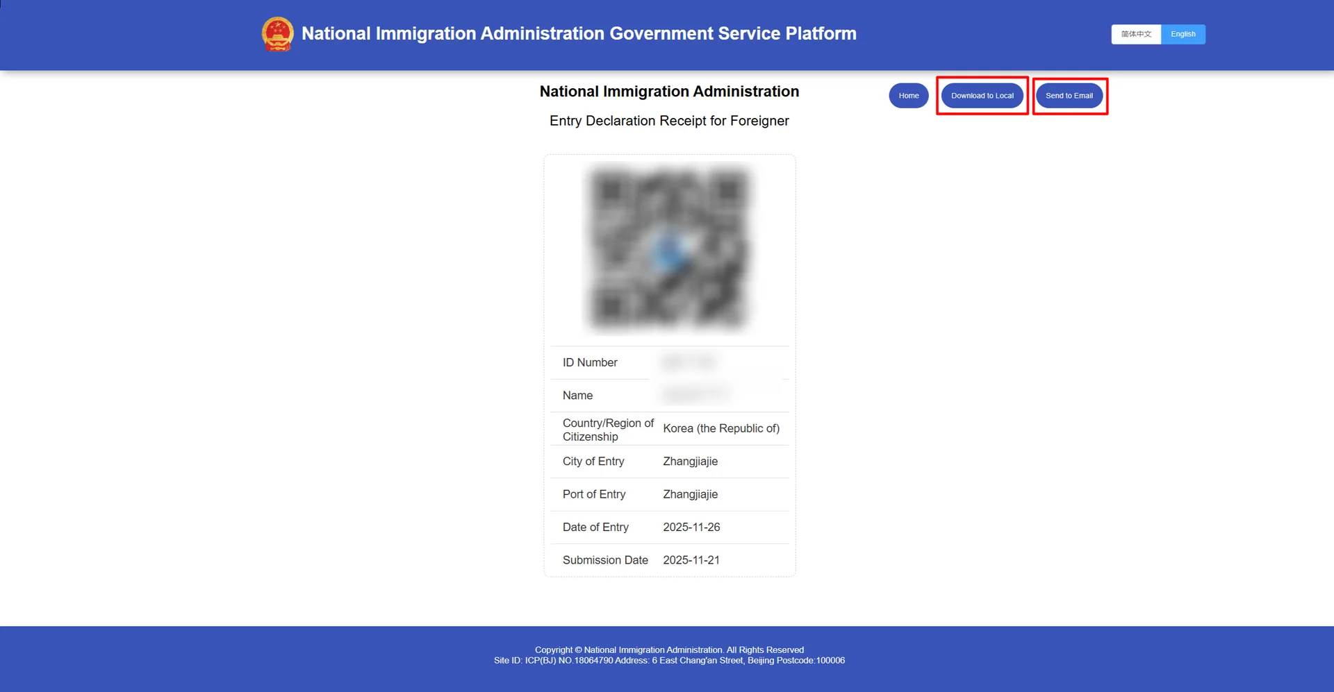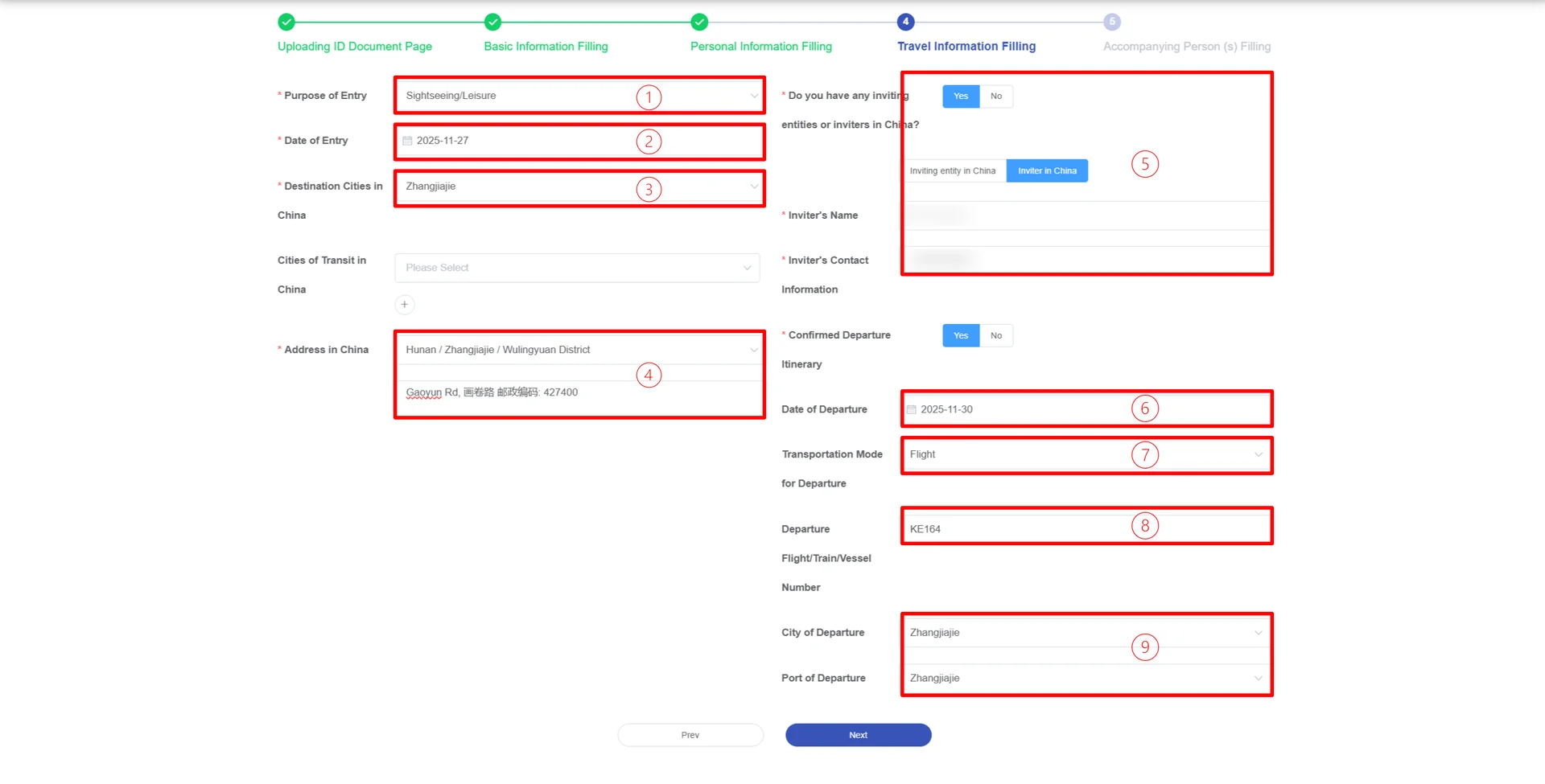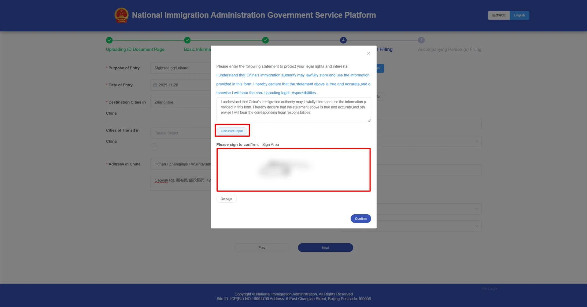 Date of Entry (입국일): 중국 도착 날짜 선택