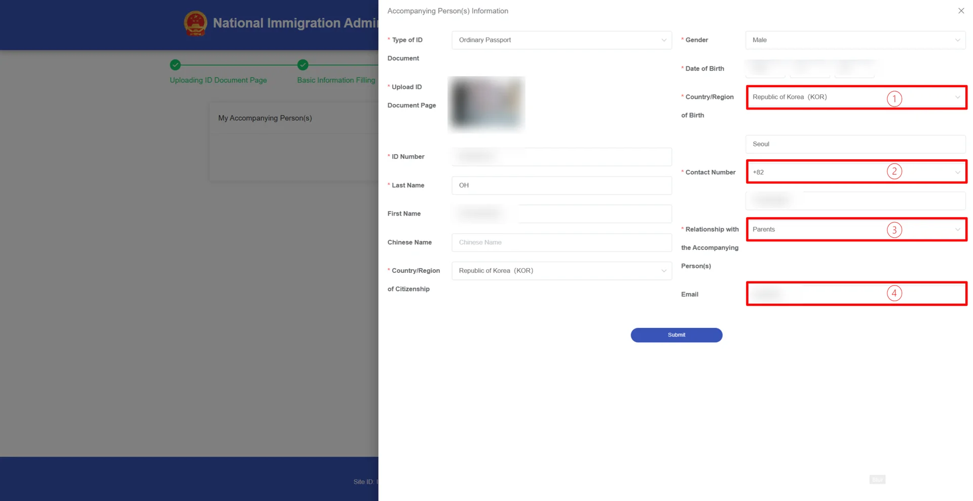 Contact Number (연락처 번호): +82로 시작하는 동반자 전화번호