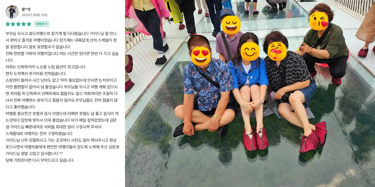 "장가계 여행을 계획할때 많이 어렵고 부담스러웠는데 마침 요모라는 플랫폼에 대해서 듣고 상담을 받으니 마음이 놓였어요. 더욱이 가이드께서 저희 가족을 잘 안내해주셔서 아주 편안한 여행이 되었습니다. 강추드립니다!"