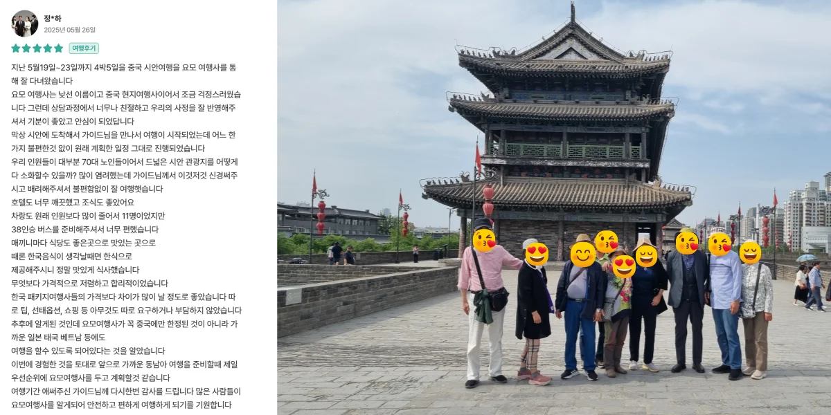 "현직 교사 8명이 시안 옌안 4박 5일 역사답사 여행 다녀왔습니다. 저희팀이 원하는 역사답사코스로 알차게 구성되어 팀원 모두 만족도가 높습니다. 프라이빗하고, 전문적이고, 학술적인 여행 답사를 원하신다면 꼭 추천드립니다!"