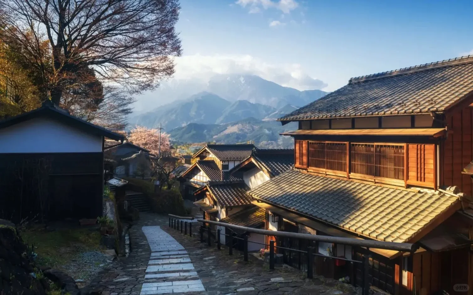 에도시대 역참 마을의 모습이 그대로 보존된 산중 마을이에요. 돌이 깔린 오르막길을 따라 전통 가옥들이 줄지어 있어 걷는 것만으로도 특별한 감성을 느낄 수 있습니다.
