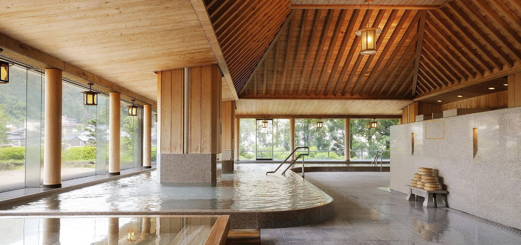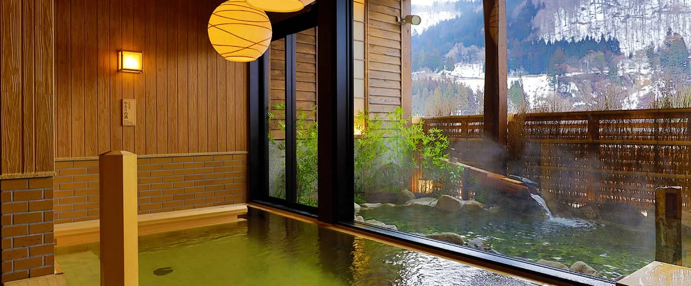 호텔 가장 높은 곳에 위치하여 게로 시내와 히다강의 풍경을 한눈에 담을 수 있는 곳입니다. 전면이 통유리로 설계되어 개방감이 압도적이며, 24시간 운영된다는 점이 큰 장점입니다. 밤에는 마을의 야경을, 아침에는 산 위로 피어오르는 물안개를 감상하며 온천을 즐길 수 있습니다. (24시간 운영)