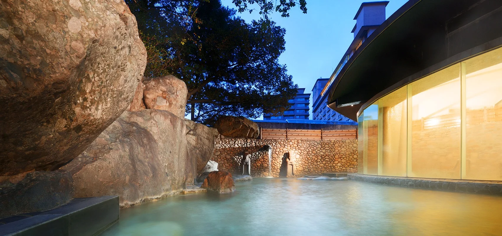 자연석과 나무들로 둘러싸인 야외 온천입니다. 인위적인 시설보다는 숲속에서 온천을 즐기는 듯한 분위기를 강조했습니다. 계절의 변화와 산바람을 직접 피부로 느낄 수 있어 노천탕 특유의 감성을 선호하는 이용객에게 만족도가 가장 높습니다. (05:00 - 익일 01:00까지 운영)