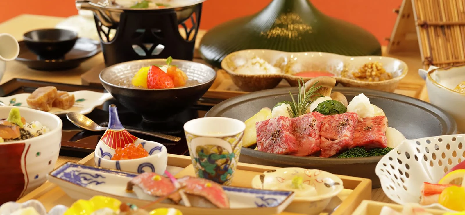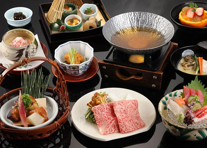 제철 산나물과 최고급 히다규 구이가 포함된 정통 가이세키 코스가 석식으로 제공됩니다. 계절에 따라 제철 식재료를 활용해 요리가 바뀌기도 하니 참고해주세요!