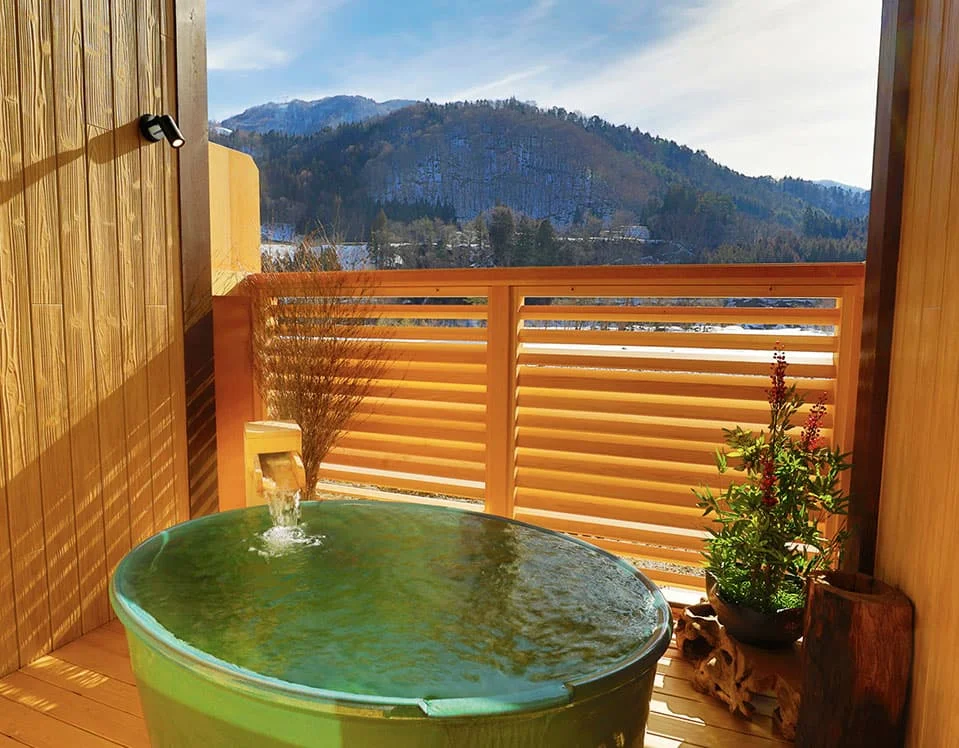 온야도 유이노쇼의 온천은 입욕 후에도 온기가 오래 지속되는 염화물천으로, 산바람을 맞으며 즐기는 노천탕이 특히 매력적입니다. 무엇보다 별도의 예약 없이 비어있을 때 누구나 문을 잠그고 이용할 수 있는 두 곳의 프라이빗 대절 온천(도기탕, 히노끼탕)이 있어 가족이나 연인끼리 오붓한 시간을 보내기에 제격입니다.