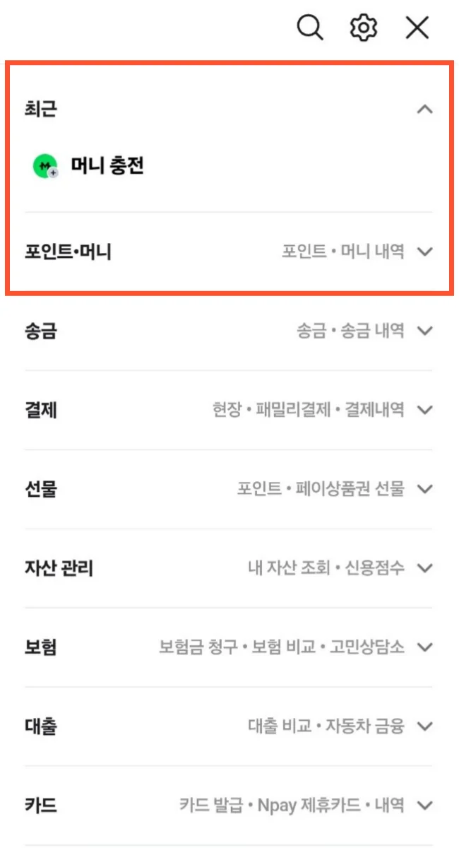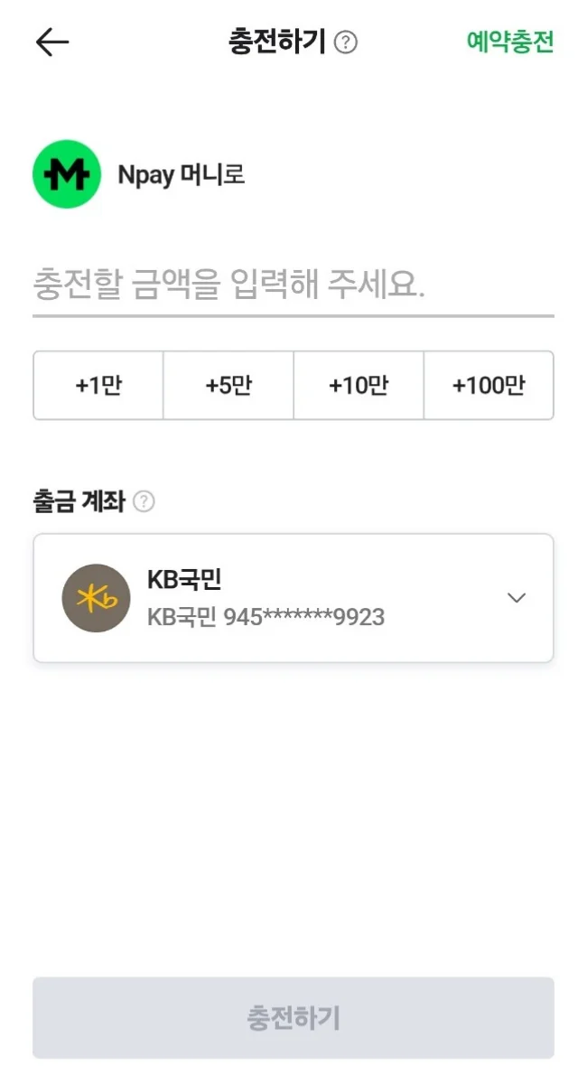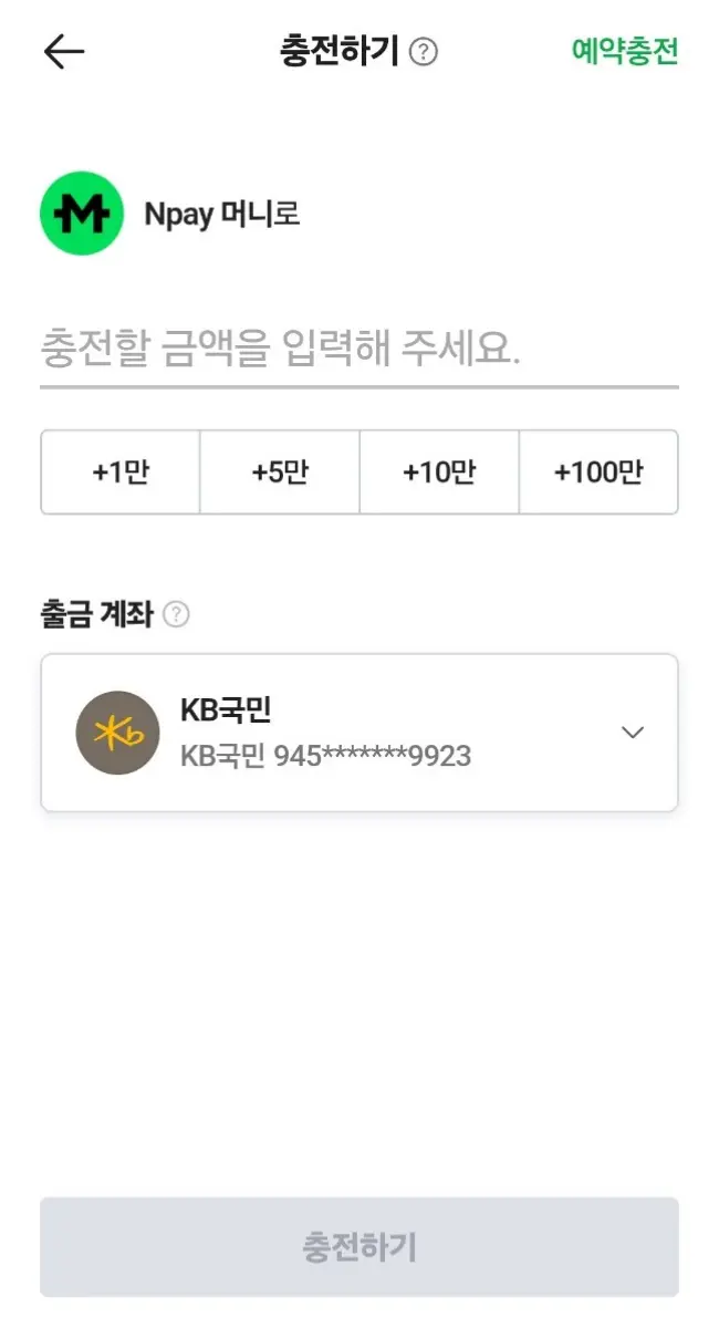 네이버페이 앱에서 '충전' 메뉴를 선택합니다