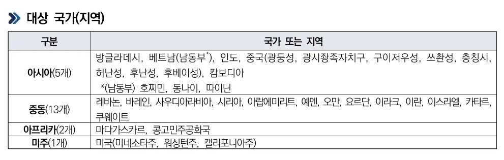 2025년 기준 중점관리지역에는 중국 일부 성(광둥·쓰촨·후난·후베이 등), 베트남 남동부(호찌민 일대), 중동 일부 국가(사우디·UAE·이란 등), 아프리카 및 미국 일부 지역 등이 포함됩니다.