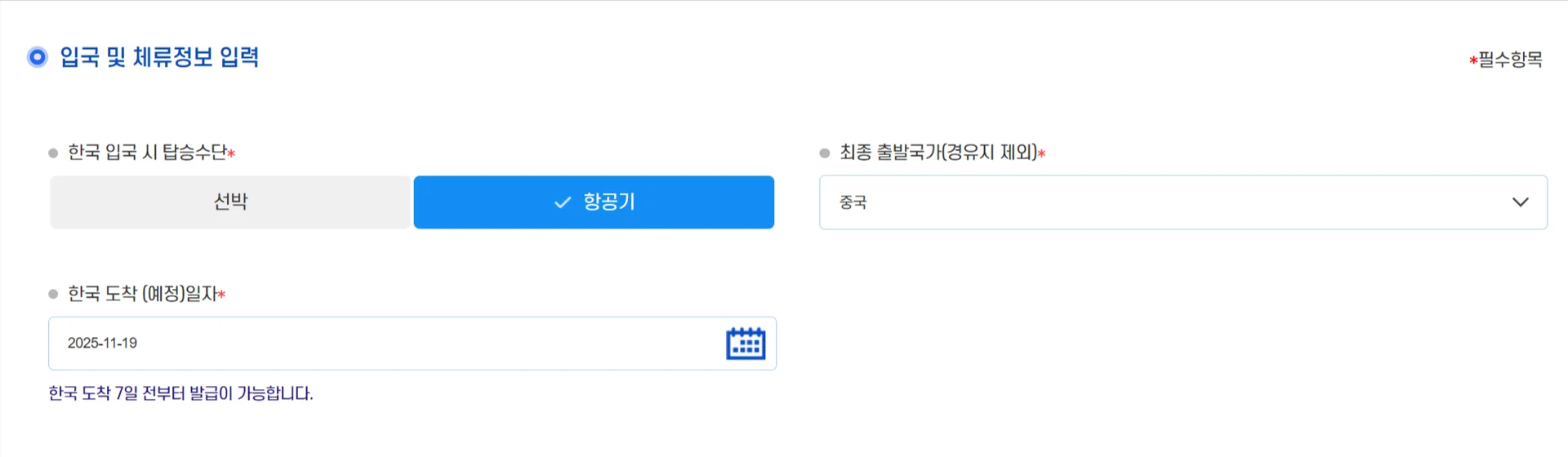 입국 시 탑승수단: 항공기 선택