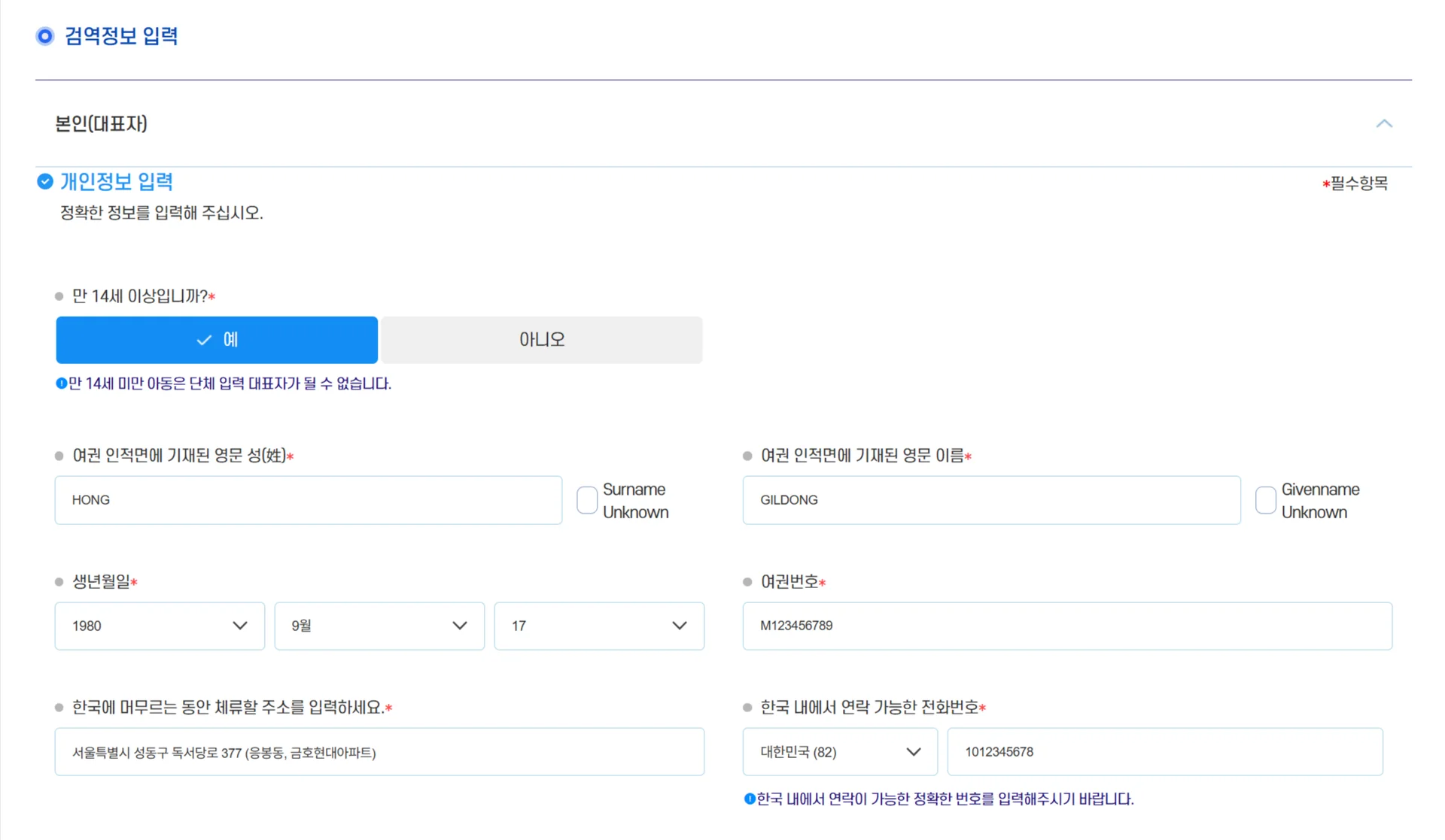 대표자가 입력하는 경우 동행자에게도 동일하게 적용됩니다.