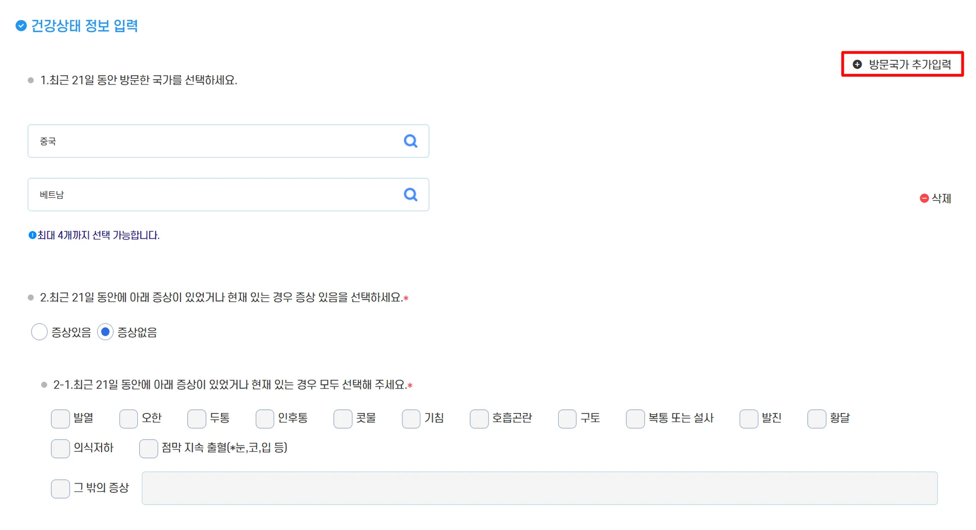 최근 21일 방문국가 선택(최대 4개)