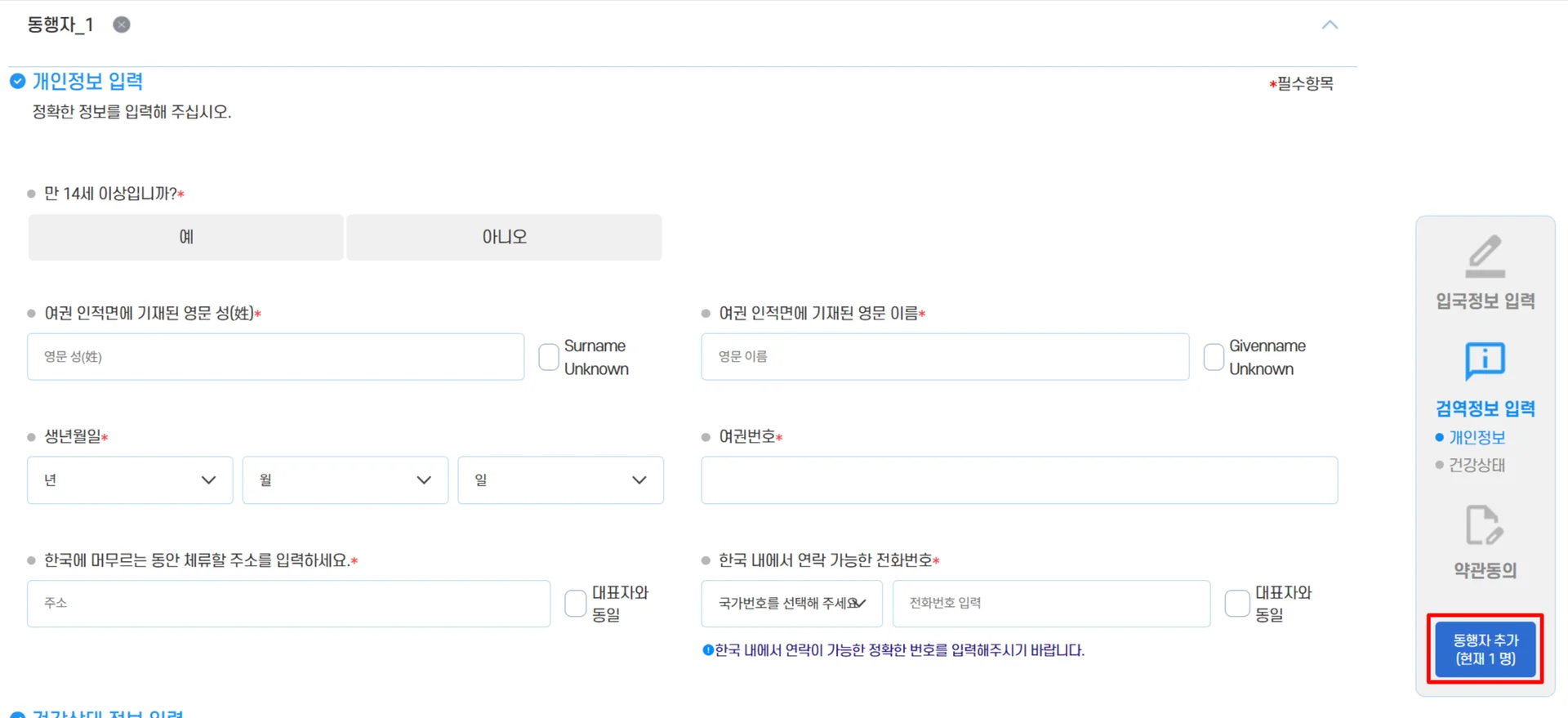 추가된 동행자도 입국정보 → 개인정보 → 건강상태 → 약관동의 과정이 동일하게 입력됩니다.