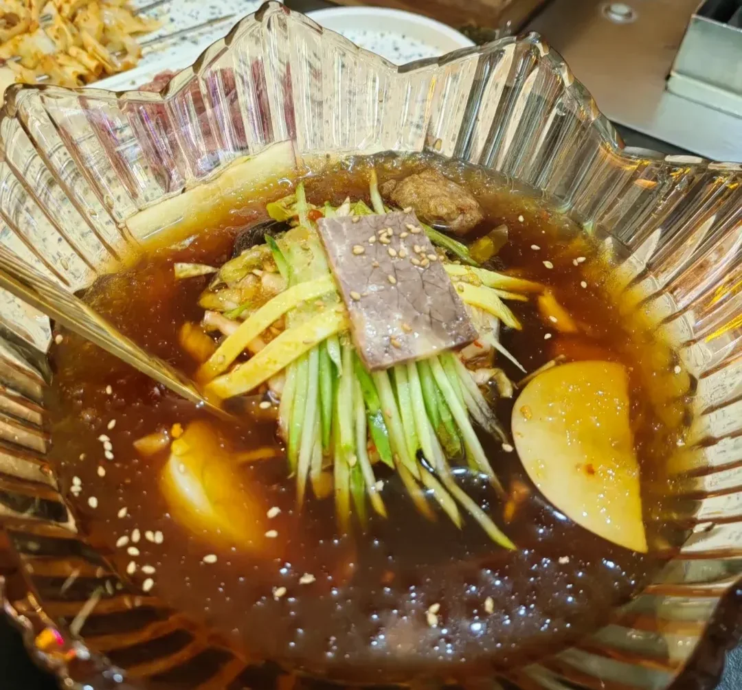 냉면: 고기를 먹은 후 입안을 깔끔하게 정리해주는 냉면! 우리나라의 냉면과는 또 다른 매력의 연변 스타일 냉면으로, 시원하고 새콤달콤한 육수라서 기름진 양꼬치와 잘 어울려요. 현지인들도 양꼬치 마무리로 꼭 주문하는 필수 메뉴입니다.