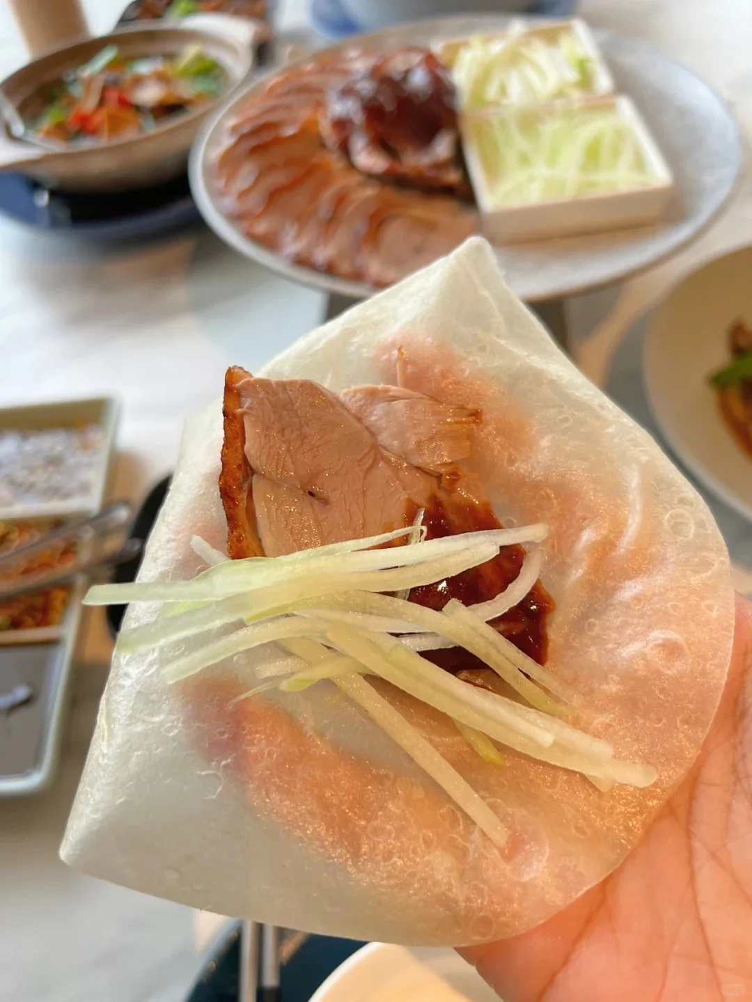 이렇게 직원분이 얇게 썰어주신 오리고기를 밀전병에 싸서 먹는 건데, 껍질이 진짜 바삭바삭하고 고기는 부드러워서 좋았어요.