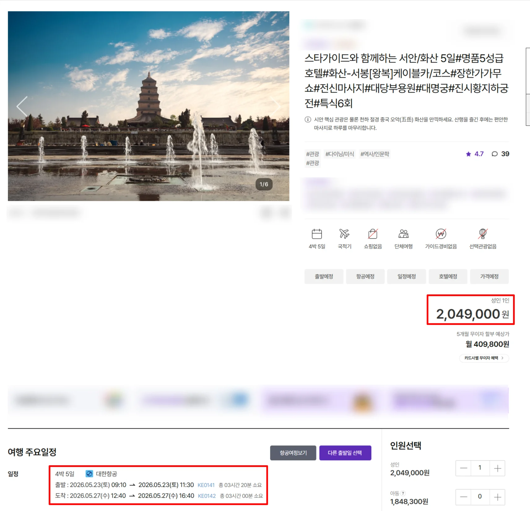 요모의 서안/화산 상품은 위에 보여드린 타 여행사의 고급 패키지 상품과 조건이 동일한데요.노쇼핑, 노옵션,노팁 그리고 식사와 모든 체험 비용이 포함된 비용입니다.
