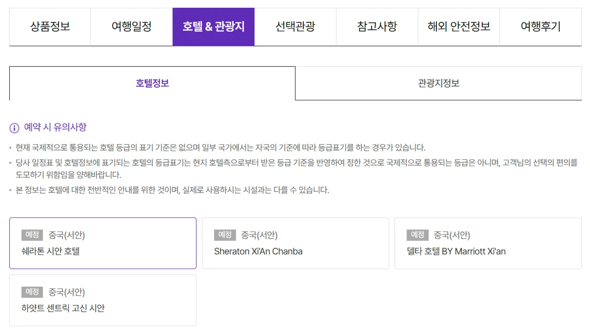 고가 패키지상품 이용 호텔은 쉐라톤 시안 호텔, 하얏트 센트릭 고신 시안, 쉐라톤 시안 찬바 등의 5성급 호텔을 이용합니다.