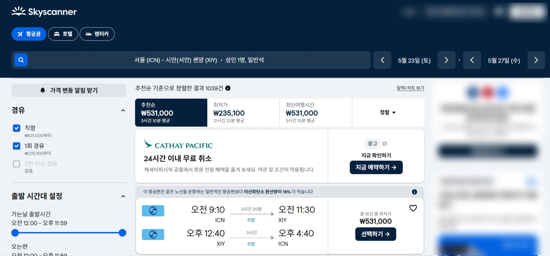 동일한 날짜 동일한 항공편을 직접 조회해보니 53만원으로 구매가 가능한 걸 확인할 수 있습니.