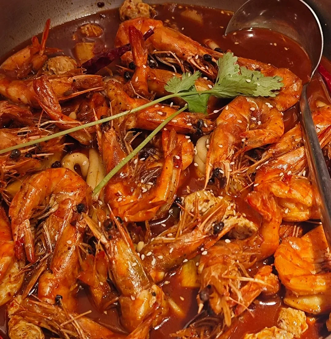 비법 소스에 볶아낸 오동통한 대하를 먹는 재미가 쏠쏠한 맛집이에요. 바삭하게 볶아내어 껍질을 벗기지 않고 그대로 씹어먹어도 부담스럽지 않구요. 대하를 어느정도 먹은 뒤에는 남은 양념에 육수를 부어 끓이면서 훠궈를 먹듯이 사리를 추가해 먹는 것이 국룰인 현지 찐맛집입니다.