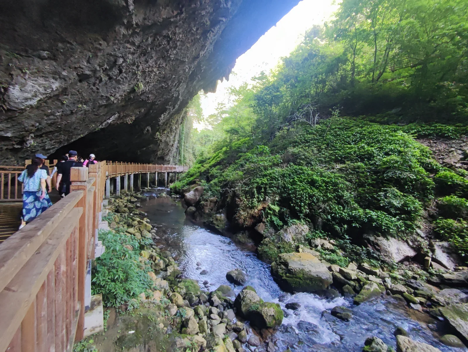 마지막 날 대협곡에서 500미터 높이의 산과 산 사이의 길이 300미터의 유리잔도에서 밑을 내려다보니 오금이 저렸다. 이 곳에서 짚라인으로 하강하여 약 500미터의 미끄럼도 재밌는 체험이었다. 산에서 나려온 후 이곳의 색다른 체험은 산과 산 좁은 협곡 계곡을 3.5키로 데크로 멋진 풍경과 좋은 공기를 마시며 걷는 것이다. (타 여행사에는 없으니 꼭 즐기세요)