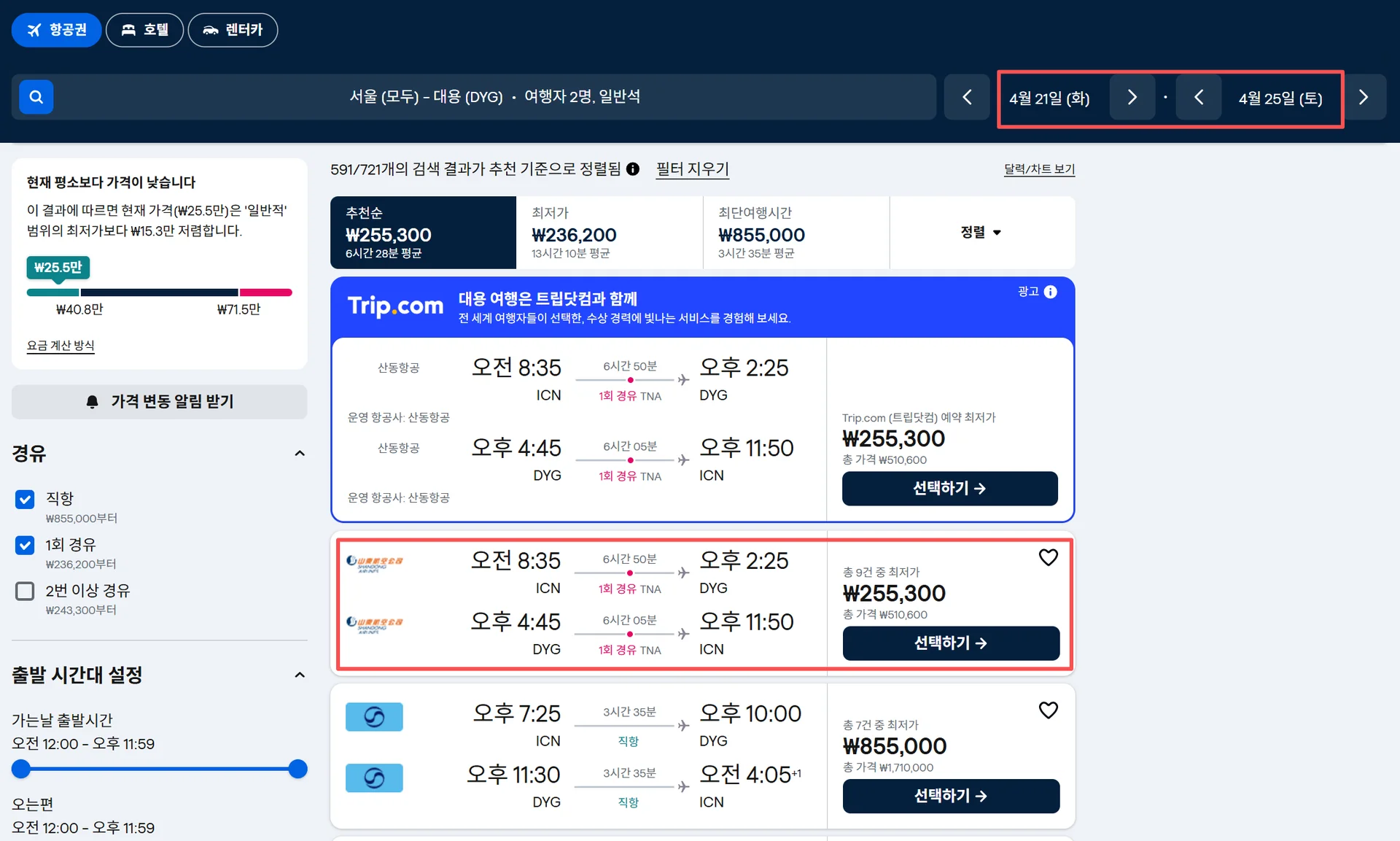 중국 제남(지난)을 경유하는 산동항공 장가계 항공편은 25만원으로 대한항공 직항편 대비 60만원이나 저렴하게 예약할 수 있습니다.